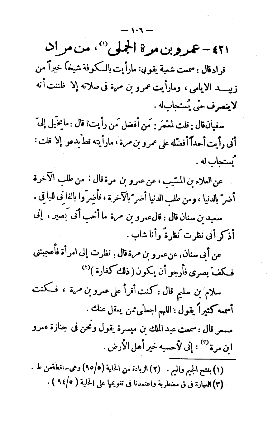 قراد قال سمعت شعبة يقول ما رأيت بالكوفة شيخا خيرا من زبيد الايامي وما رأيت عمرو بن مرة في صلاته إلا ظننت أنه لا ينصرف حتى يستجاب له