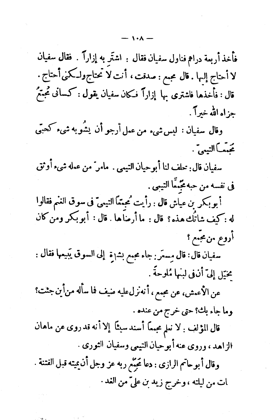 فأخذ أربعة دراهم فناول سفيان فقال اشتر به إزارا فقال سفيان لا أحتاج إليها قال مجمع صدقت أنت لا تحتاج ولكني أحتاج قال فأخذها فاشترى بها إزارا فكان سفيان يقول كسائي مجمع جزاه الله خيرا