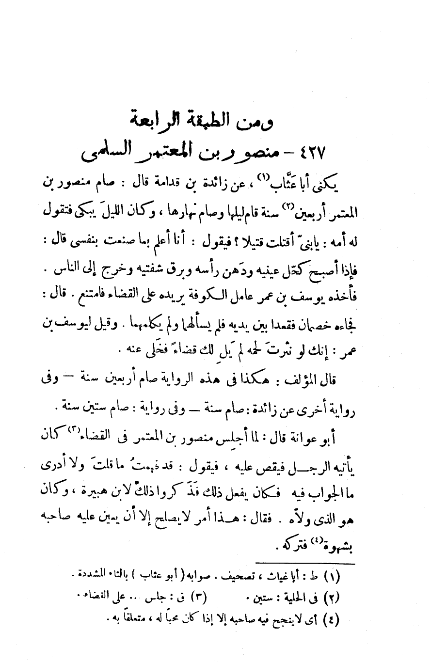 يكنى أبا عثاب عن زائدة بن قدامة قال صام منصور بن المعتمر أربعين سنة قام ليلها وصام نهارها ةكان اليل يبكى فتقول له أمه يا بني أقتلت قتيلا فيقول أنا أعلم بما صنعت بنفسى قال فإذا أصبح كحل عينيه ودهن رأسه وبرق شفتيه وخرج إلى الناس فأخذه يوسف بن عمر عامل الكوفة يريده على القضاء فامتنع قال فجاءه خصمان فقعدا بين يديه فلم يسألهما ولم يكلمهما وقيل ليوسف بن عمر إنك لو نثرت لحمه لم يل لك قضاء فخلى عنه