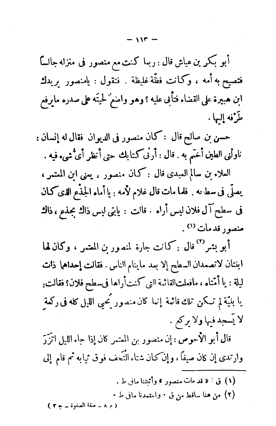 أبو بشر قال كانت جارة لمنصور بن المعتمر وكان لها ابنتان لاتصعدان السطح إلا بعد ما ينام الناس فقالت إحداهما ذات ليلة يا أمتاه ما فعلت القائمة التي كنت أراها في سطح فلان فقالت يا بنية لم تكن تلك قائمة إنما كان منصور يحيى الليل كله في ركعة لا يسجد فيها ولا يركع