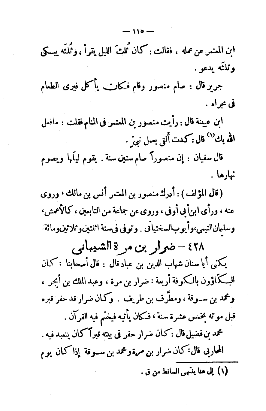 يكنى أبا سنان شهاب الدين بن عباد قال قال أصحابنا كان البكاؤون بالكوفة أربعة ضرار بن مرة وعبدالملك بن أبجر ومحمد بن سوقة ومطرف بن طريف وكان ضرار قد حفر قبره قبل موته بخمس عشرة سنة فكان يأتيه فيختم فيه القرآن