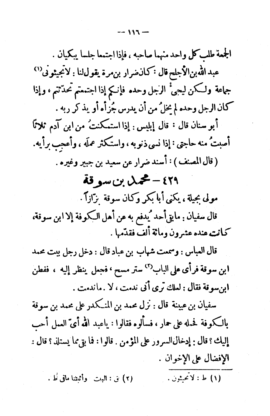 عبدالله بن الأجلح قال كان ضرار بن مرة يقول لنا لا تجيئوني جماعة ولكن ليجىء الرجل وحده فإنكم إذا اجتمعتم تحدثتم وإذا كان الرجل وحده لم يخل من أن يدرس جزأه أو يذكر ربه