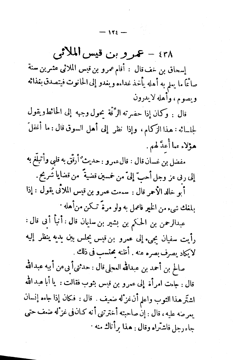 مفضل بن غسان قال قال عمرو حديث أرقق به قلبي وأتبلغ به إلى ربي عز و جل أحب إلي من خمسين قضية من قضايا شريح
