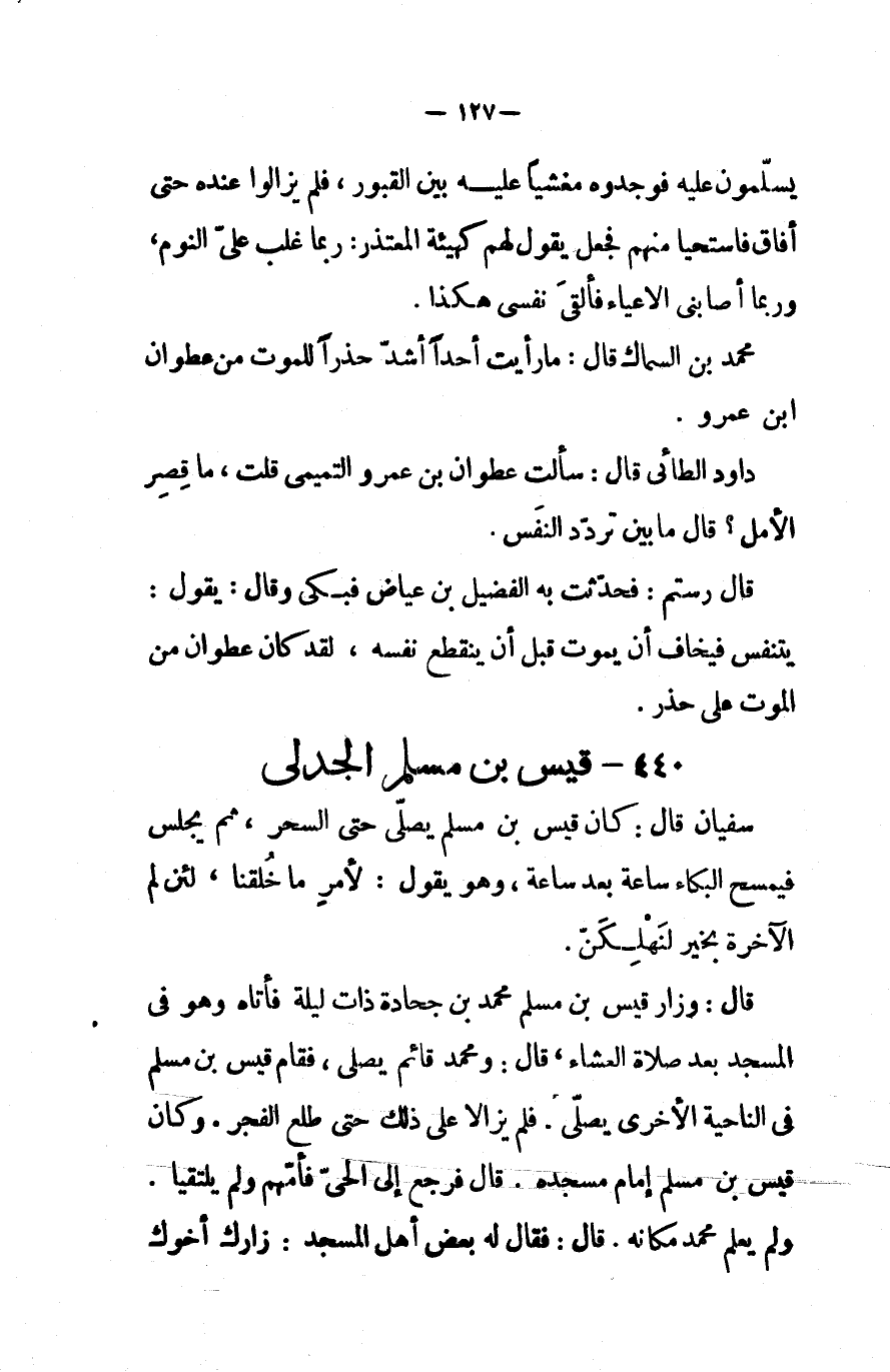 سفيان قال كان قيس بن مسلم يصلى حتى السحر ثم يجلس فيمسح البكاء ساعة بعد ساعة وهو يقول لأمر ما خلقنا لئن لم الآخرة بخير لنهلكن