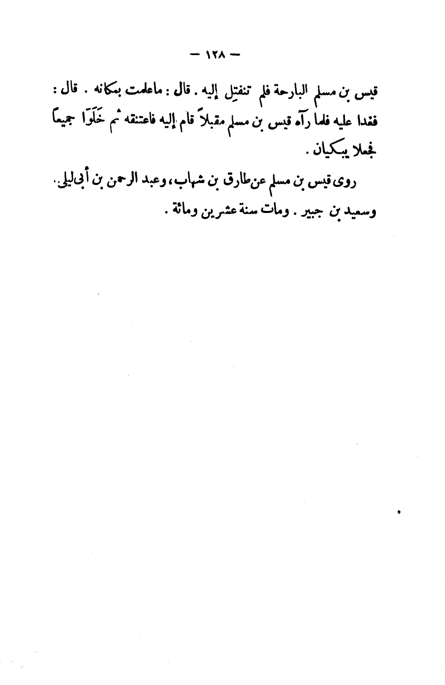 قيس بن مسلم البارحة فلم تنفتل إليه قال ما علمت بمكانه قال فغدا عليه فلما رآه قيس بن مسلم مقبلا قام إليه فاعتنقه ثم خلوا جميعا فجعلا يبكيان