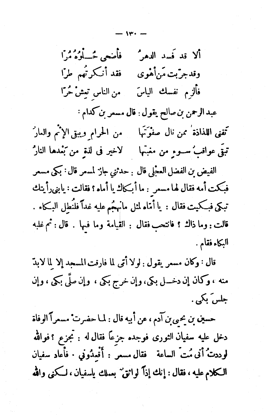 قال وكان مسعر يقول لولا أمي لما فارقت المسجد إلا لما لا بد منه وكان إن دخل بكى وإن خرج بكى وإن صلى بكى وإن جلس بكى
