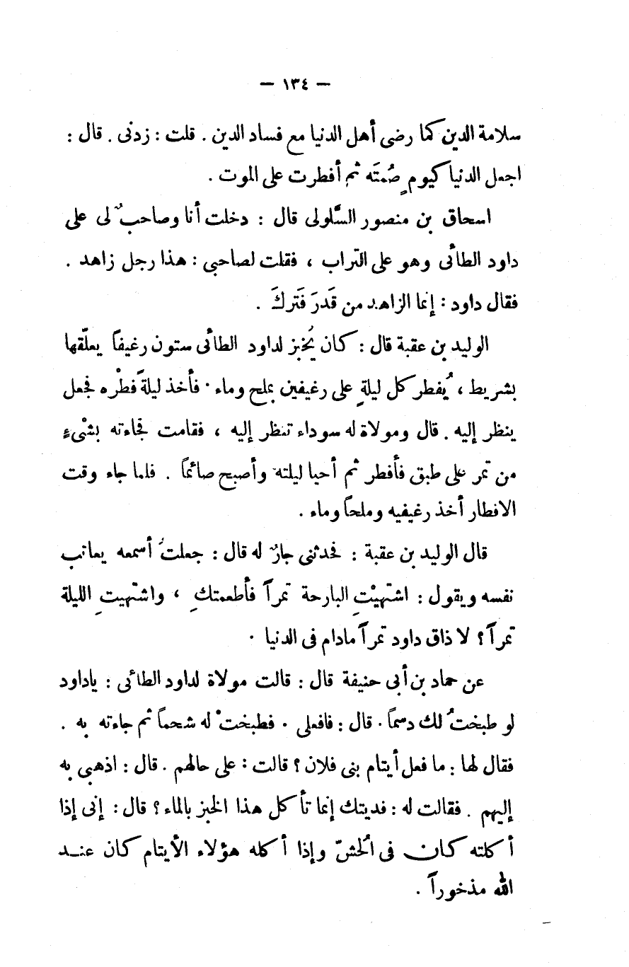 عن حماد بن ابي حنيفة قال قالت مولاة لداود الطائي يا داود لو طبخت لك دسما قال فافعلي فطبخت له شحما ثم جاءته به فقال لها ما فعل أيتام بني فلان قالت على حالهم قال اذهبي به إليهم فقالت له فديتك إنما تأكل هذا الخبز بالماء قال إني إذا أكلته كان في الحش وإذا أكله هؤلاء الأيتام كان عند الله مذخورا