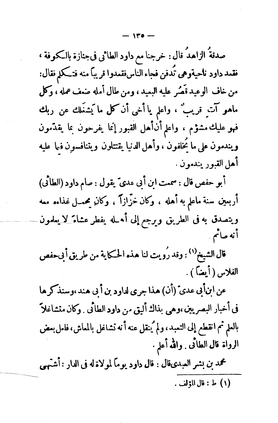 عن أبن أبي عدي أن هذا جرى داود بن أبي هند وسنذكرها في أخبار البصريين وهي بذاك أليق من داود الطائي وكان متشاغلا بالعلم ثم انقطع إلى التعبد ولم ينقل عنه أنه تشاغل بالمعاش فلعل بعض الرواة قال الطائي والله أعلم