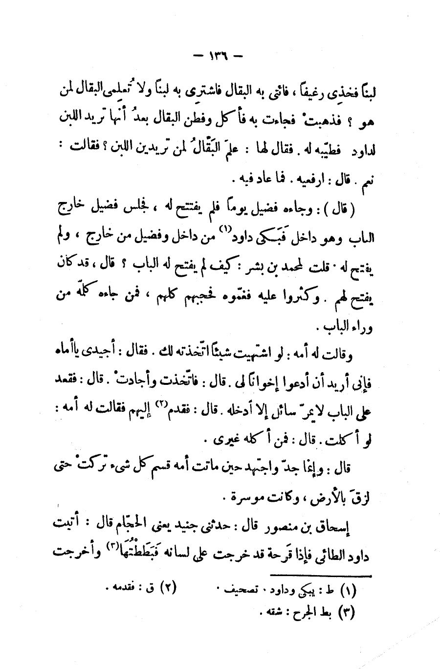 إسحاق بن منصور قال حدثني جنيد يعني الحجام قال أتيت داود الطائي فإذا قرحة قد خرجت على لسانه فبططتها وأخرجت