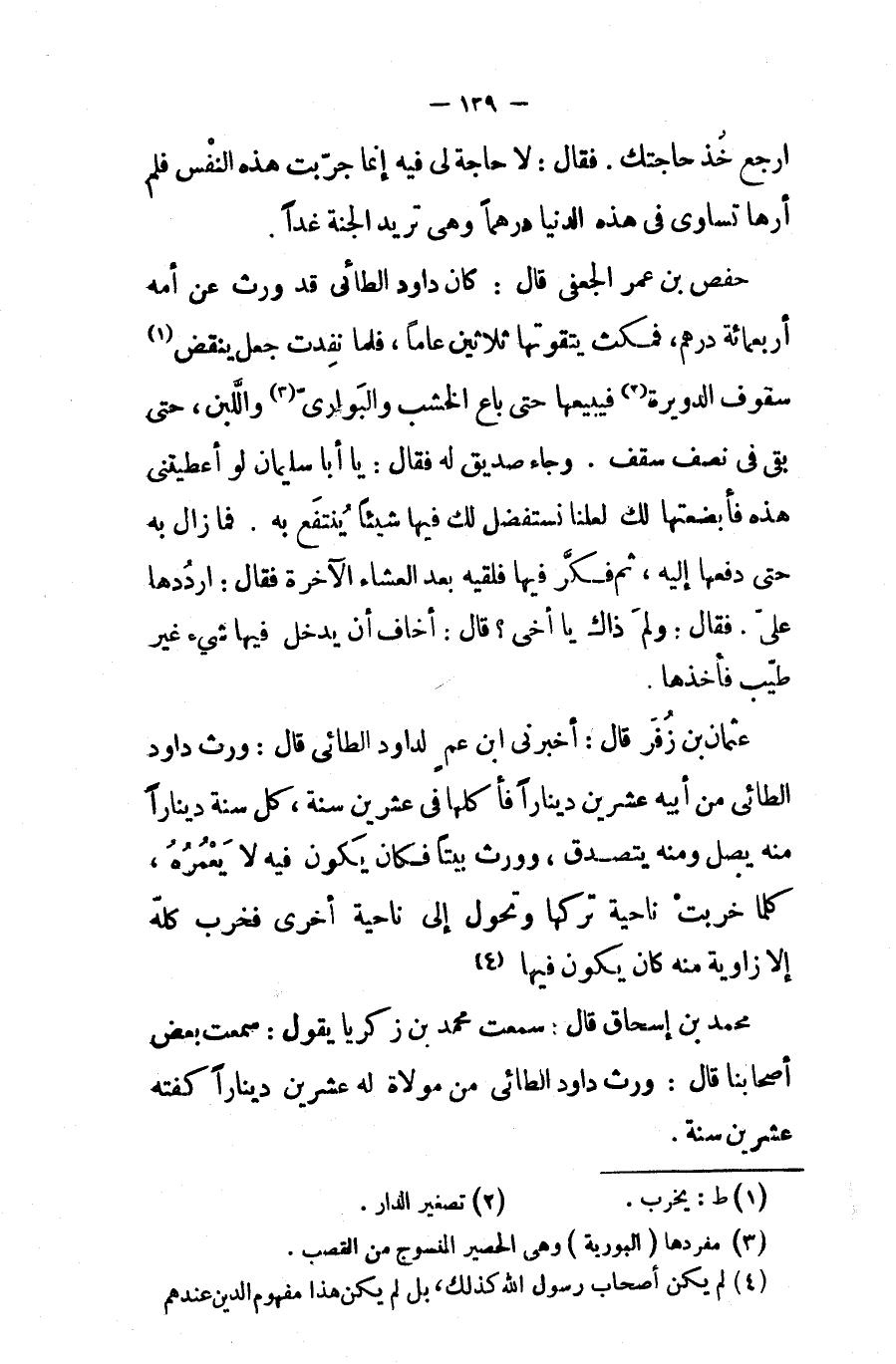 محمد بن إسحاق قال سمعت محمد بن زكريا يقول سمعت بعض اصحابنا قال ورث داود الطائي من مولاة له عشرين دينارا كفته عشرين سنة