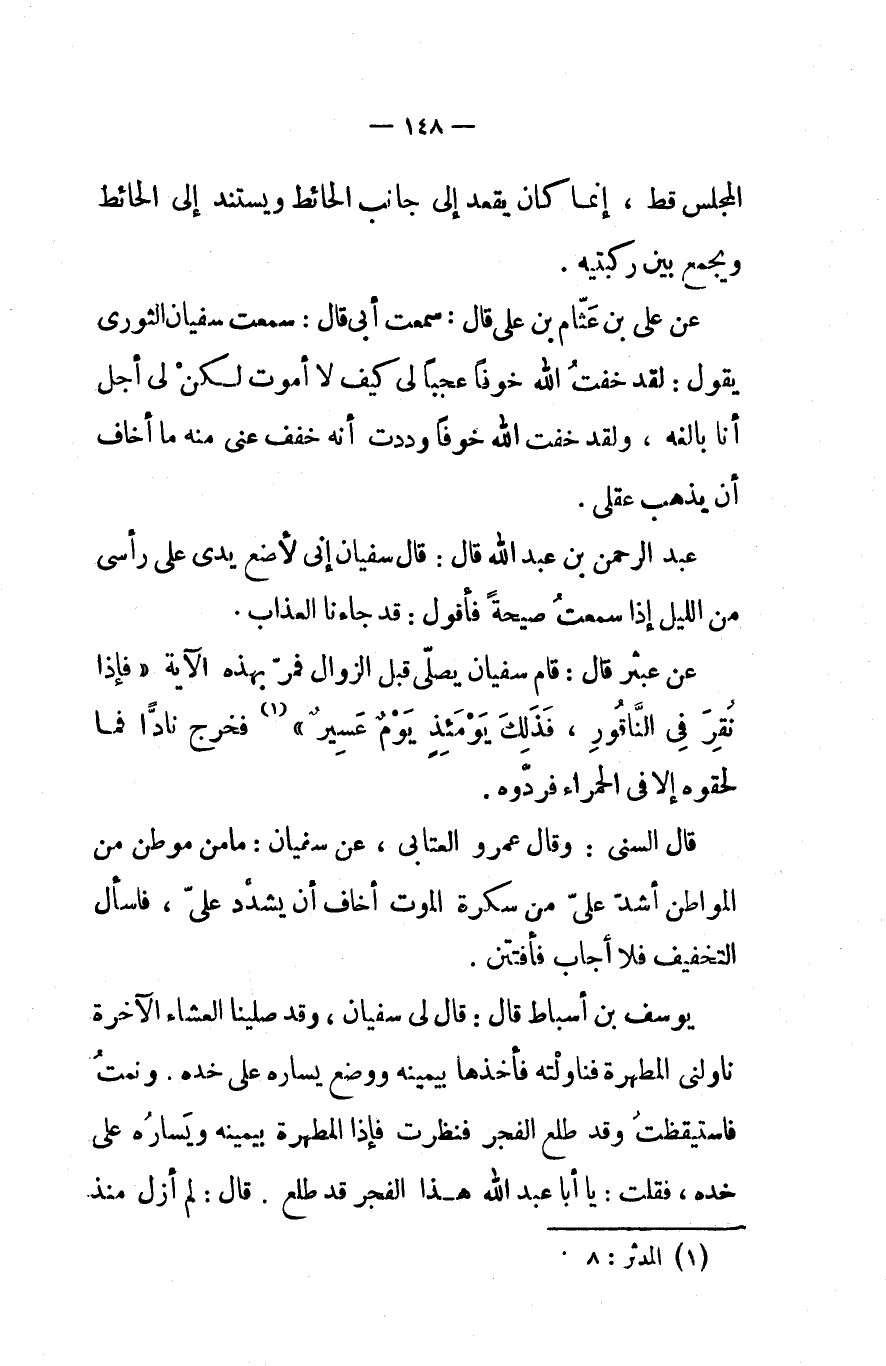 يوسف بن أسباط قال قال لي سفيان وقد صلينا العشاء الآخرة ناولني المطهرة فناولته فأخذها بيمينه ووضع يساره على خده ونمت فاستيقظت وقد طلع الفجر فنظرت فإذ المطهرة بيمينه ويساره على خده فقلت يا أبا عبدالله هذا الفجر قد طلع قال لم أزل منذ