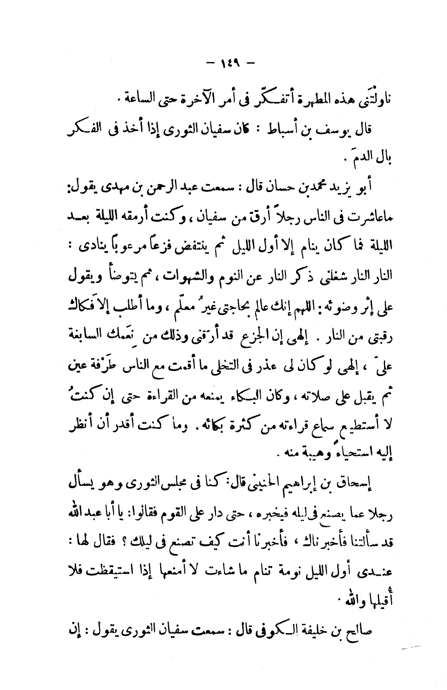 أبو يزيد محمد بن حسان قال سمعت عبدالرحمن بن مهدي يقول ما عاشرت في الناس رجلا أرق من سفيان وكنت أرمقه الليلة بعد الليلة فما كان ينام إلا أول الليل ثم ينتفض فزعا مرعوبا ينادي النار النار شغلني ذكر النار عن النوم والشهوات ثم يتوضأ ويقول على إثر وضوئه اللهم إنك عالم بحاجتي غير معلم وما أطلب إلا فكاك رقبتي من النار إلهي إن الجزع قد أرقنى وذلك من نعمك السابغة على إلهي لو كان لي عذر في التخلي ما أقمت مع الناس طرفة عين ثم يقبل على صلاته وكان البكاء يمنعه من القراءة حتى إن كنت لا استطيع سماع قراءته من كثرة بكائه وما كنت أقدر أن أنظر إليه استحياء وهيبة منه