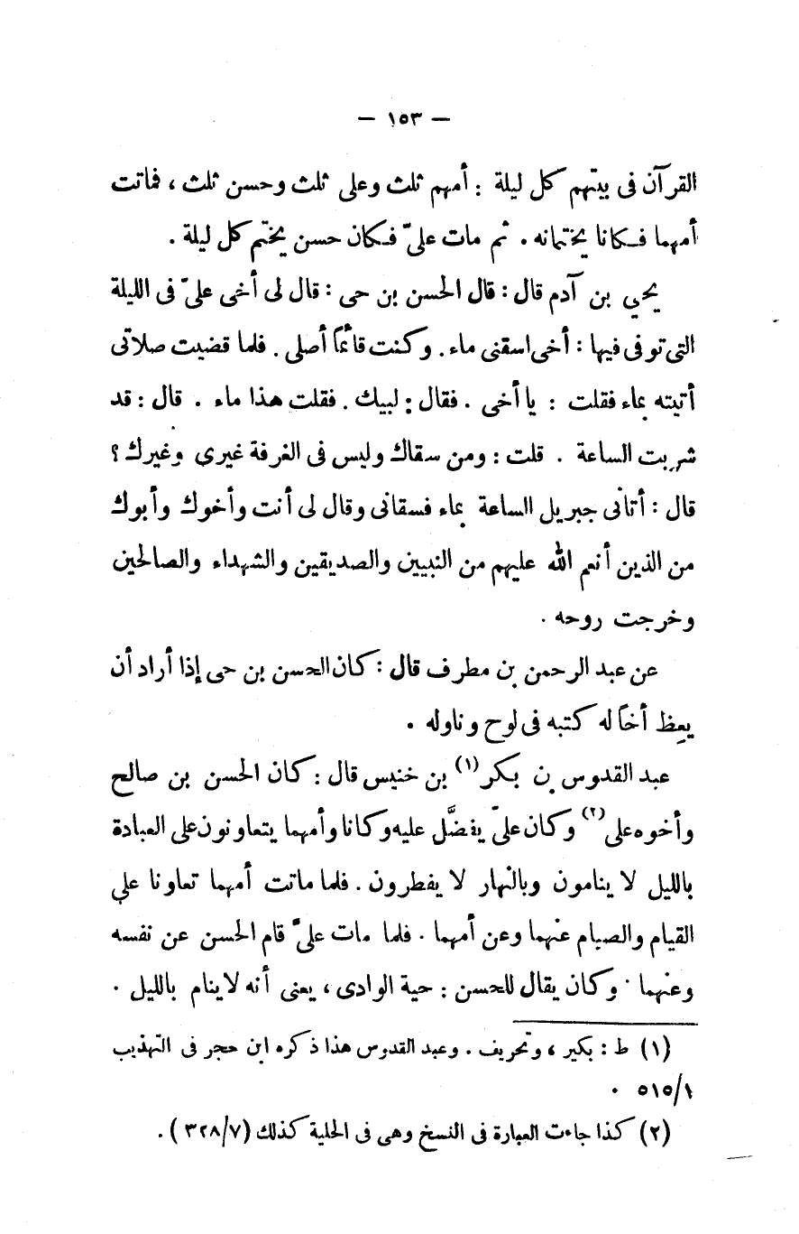 عبد القدوس بن بكر بن خنيس قال كان الحسن بن صالح وأخوه على وكان على يفضل عليه وكانا وأمهما يتعاونون على العبادة بالليل لا ينامون وبالنهار لا يفطرون فلما ماتت أمهما تعاونا على القيام والصيام عنهما وعن أمهما فلما مات علي قام الحسن عن نفسه وعنهما وكان يقال للحسن حية الوادى يعني أنه لا ينام بالليل