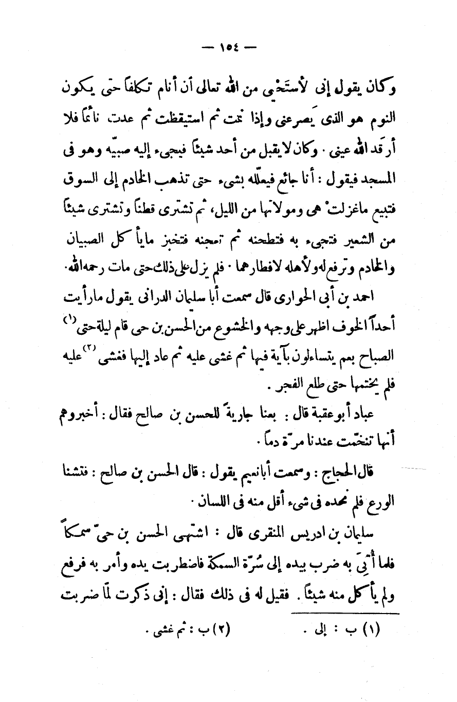 وكان يقول إني لاستحي من الله تعالى أن أنام تكلفا حتى يكون النوم هو الذي يصرعني وإذا نمت ثم استيقظت ثم عدت نائما فلا أرقد الله عيني وكان لا يقبل من أحد شيئا فيجىء إليه صبيه وهو في المسجد فيقول أنا جائع فيعلله بشيء حتى تذهب الخادم إلى السوق فتبيع ما غزلت هي ومولاتها من الليل ثم تشترى قطنا وتشترى شيئا من الشعير فتجىء به فتطحنه ثم تعجنه فتخبز ما يأكل الصبيان والخادم وترفع له ولأهله لافطارهما فلم يزل على ذلك حتى مات رحمه الله