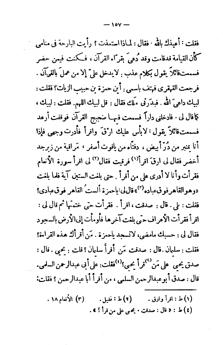 فقلت أعيذك بالله فقال لماذا استعذت رأيت البارحة في منامي كأن القيامة قد قامت وقد دعى بقراء القرآن فكنت فيمن حضر فسمعت قائلا يقول بكلام عذب لا يدخل علي إلا من عمل بالقرآن فرجعت القهقري فهتف باسمى أين حمزة بن حبيب الزيات فقلت لبيك داعى الله فبدرني ملك فقال قل لبيك اللهم فقلت لبيك كما قال لي فأدخلني دارا فسمعت فيها ضجيج القرآن فوقفت أرعد فسمعت قائلا يقول لا بأس عليك ارق واقرأ فأدرت وجهي فإذا أنا بمنبر من در أبيض دفتاه من ياقوت أصفر مراقيه من زبرجد أخضر فقال لي ارق اقرأ فرقيت فقال لي اقرأ سورة الأنعام فقرأت وأنا لا أدري على من أقرأ حتى بلغت الستين آية فلما بلغت وهو القاهر فوق عباده قال لي يا حمزة ألست القاهر فوق عبادي فقلت بلى قال صدقت اقرأ فقرأت حتى ختمتها ثم قال لي اقرأ فقرأت الأعراف حتى بلغت آخرها فأومأت إلى الأرض بالسجود فقال لي حسبك ما مضى لا تسجد يا حمزة من أقرأك هذه القراءة فقلت سليمان قال صدقت من أقرأ سليمان قلت يحيى قال صدق يحيى على من قرأ يحيى فقلت على أبي عبدالرحمن السلمي قال صدق أبو عبدالرحمن السلمى من أقرأ أبا عبدالرحمن فقلت