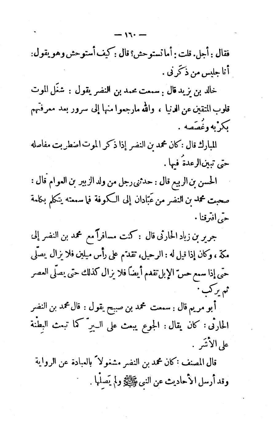 الحسن بن الربيع قال حدثني رجل من ولد الزبير بن العوام قال صحبت محمد بن النضر من عبادان إلى الكوفة فما سمعته يتكلم بكلمة حتى افترقنا