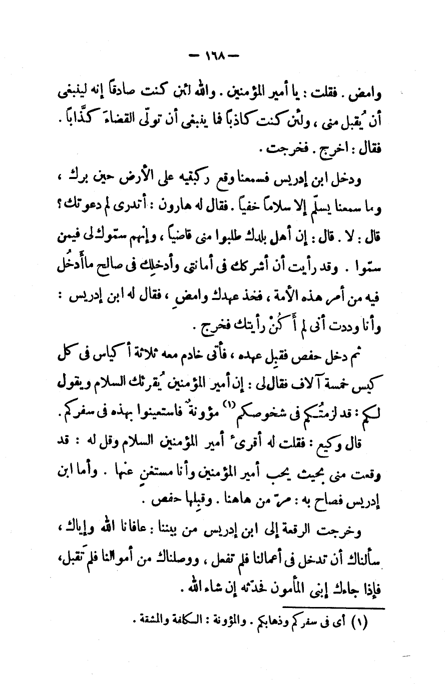 وخرجت الرقعة إلى ابن إدريس من بيننا عافانا الله وإياك سألناك أن تدخل في أعمالنا فلم تفعل ووصلناك من أموالنا فلم تقبل فإذا جاءك إبني المأمون فحدثه إن شاء الله