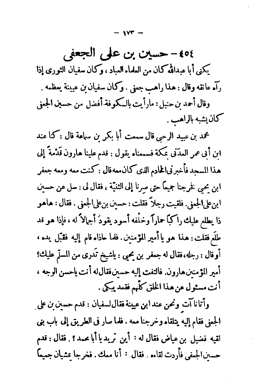 وأتانا آت ونحن عند ابن عيينة فقال لسفيان قدم حسين بن علي الجعفى فقام إليه يتلقاه وخرجنا معه فلما صار في الطريق إلى باب بنى لقيه فضيل بن عياض فقال له أين تريد يا أبا محمد فقال قدم حسين الجعفى فأردت لقاءه فقال أنا معك فخرجا يمشيان جميعا