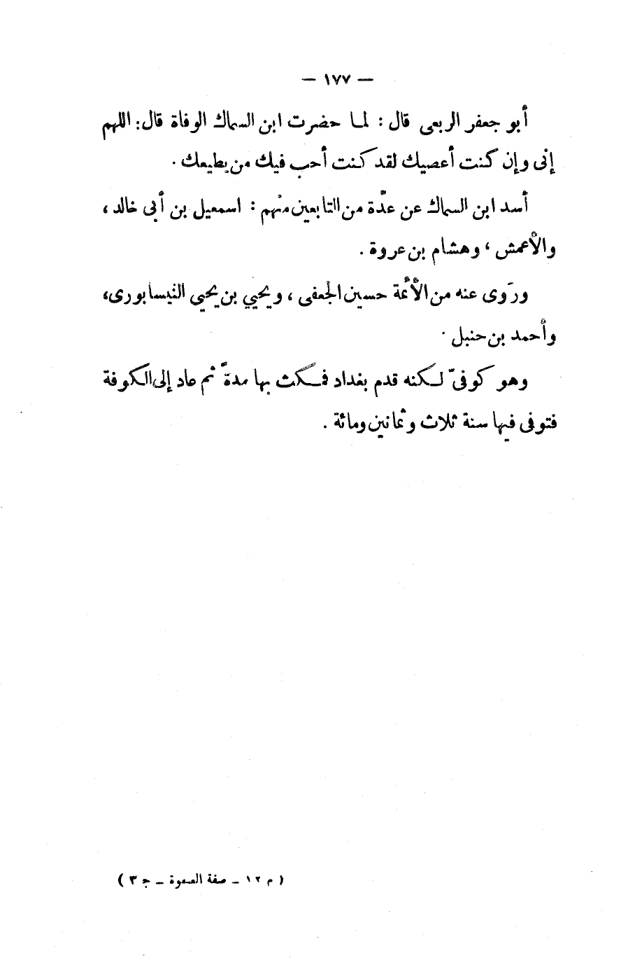 وهو كوفى لكنه قدم بغداد فمكث بها مدة ثم عاد إلى الكوفة فتوفى فيها سنة ثلاث وثمانين ومائة