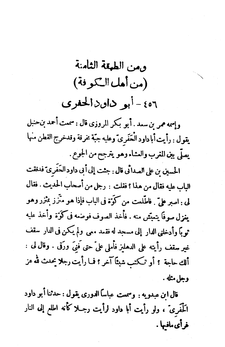 وإسمه عمر بن سعد أبو بكر المروزى قال سمعت أحمد بن حنبل يقول رأيت أبا داود الحفرى وعليه جبة مخرقة وقد خرج القطن منها يصلى بين المغرب والعشاء وهو يترجح من الجوع