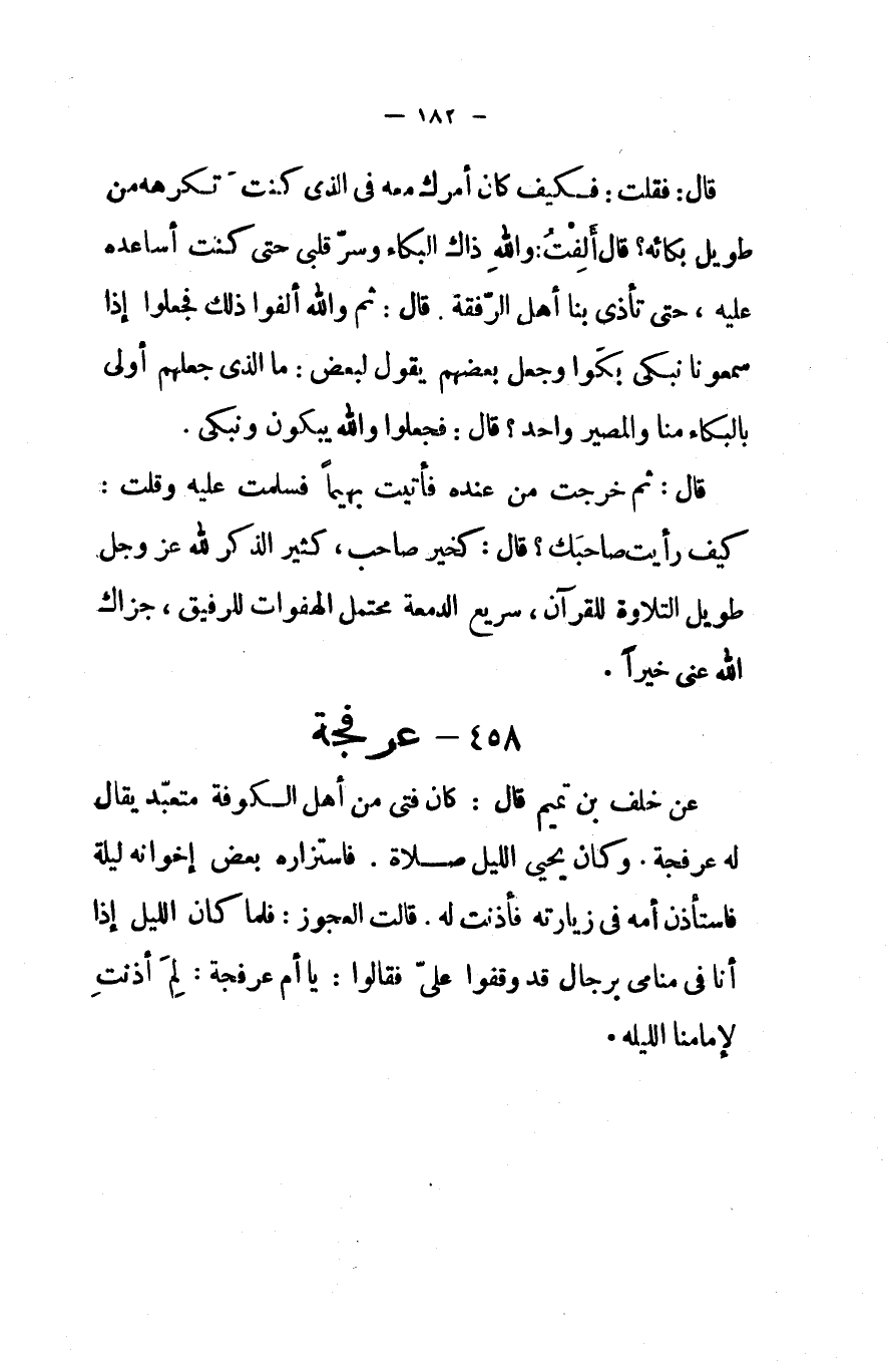 عن خلف بن تميم قال كان فتى من أهل الكوفة متعبد يقال له عرفجة وكان يحيى الليل صلاة فاستزاره بعض إخوانه ليلة فاستاذن أمه في زيارته فأذنت له قالت العجوز فلما كان الليل إذا أنا في منامى برجال قد وقفوا على فقالوا يا أم عرفجة لم أذنت لإمامنا الليلة