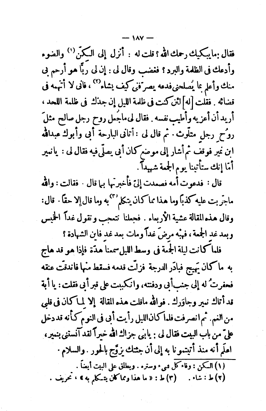 فقال ما يبكيك رحمك الله قلت له أنزل إلى الكن والضوء وأدعك في الظلمة والبرد فغضب وقال لي إن لي ربا هو أرحم بي منك وأعلم بما يصلحني فدعه يصرفني كيف يشاء فإني لا أتهمه في قضائه فقلت له لئن كنت في ظلمة الليل إن جدك في ظلمة اللحد أريد أن أعزيه وأطيب نفسه فقال لي ما جعل روح رجل صالح مثل روح رجل متلوث ثم قال لي أتاني البارحة أبي وأبوك عبدالله ابن نمير فوقف ثم أشار إلى موضع كان أبي يصلى فيه فقال لي يا نمير أما إنك ستأتينا يوم الجمعة شهيدا
