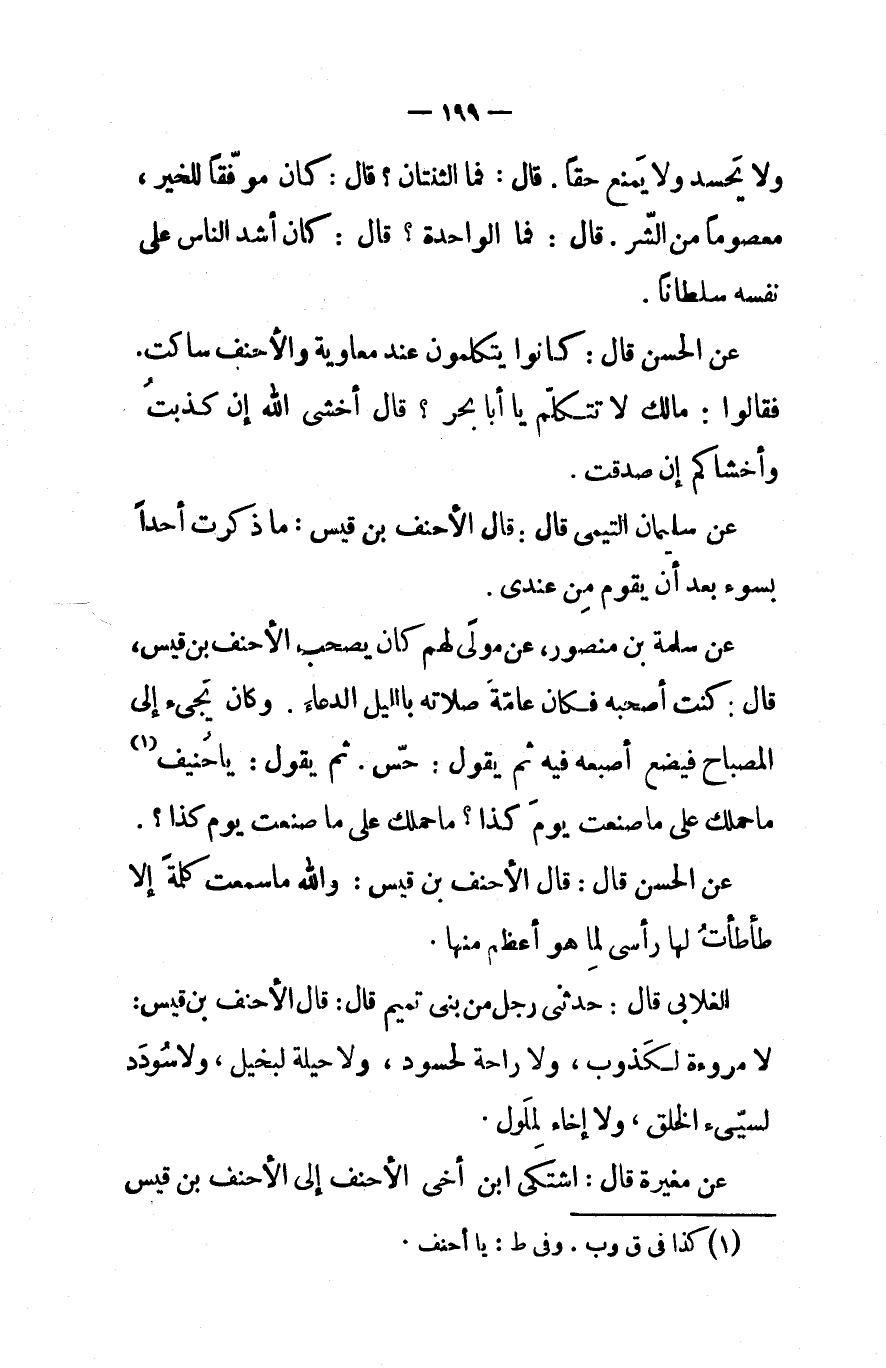 عن سليمان التيمى قال قال الأحنف بن قيس ما ذكرت أحدا بسوء بعد أن يقوم من عندي