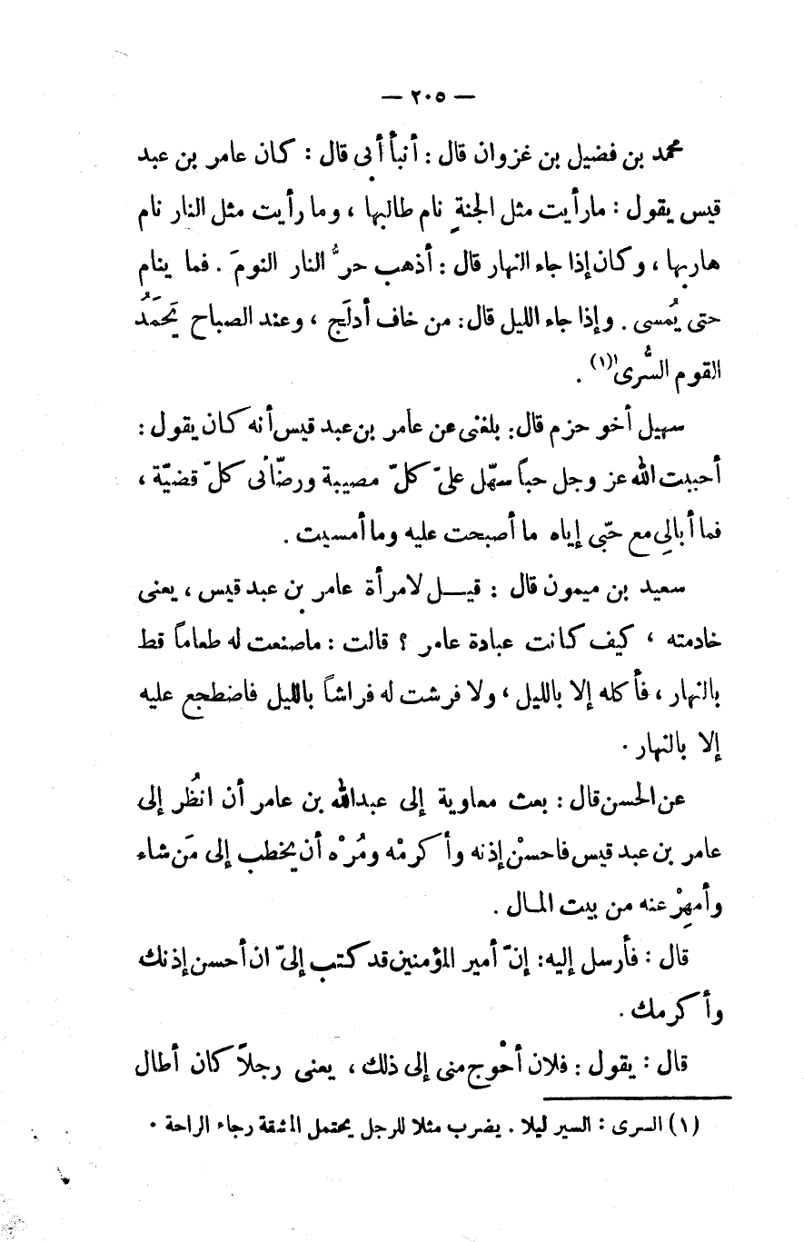 محمد بن فضيل بن غزوان قال أنبأ أبى قال كان عامر بن عبد قيس يقول ما رأيت مثل الجنة نام طالبها وما رأيت مثل النار نام هاربها وكان إذا جاء النهار قال أذهب حر النار النوم فما ينام حتى يمسى وإذا جاء الليل قال من خاف أدلج وعند الصباح يحمد القوم السرى