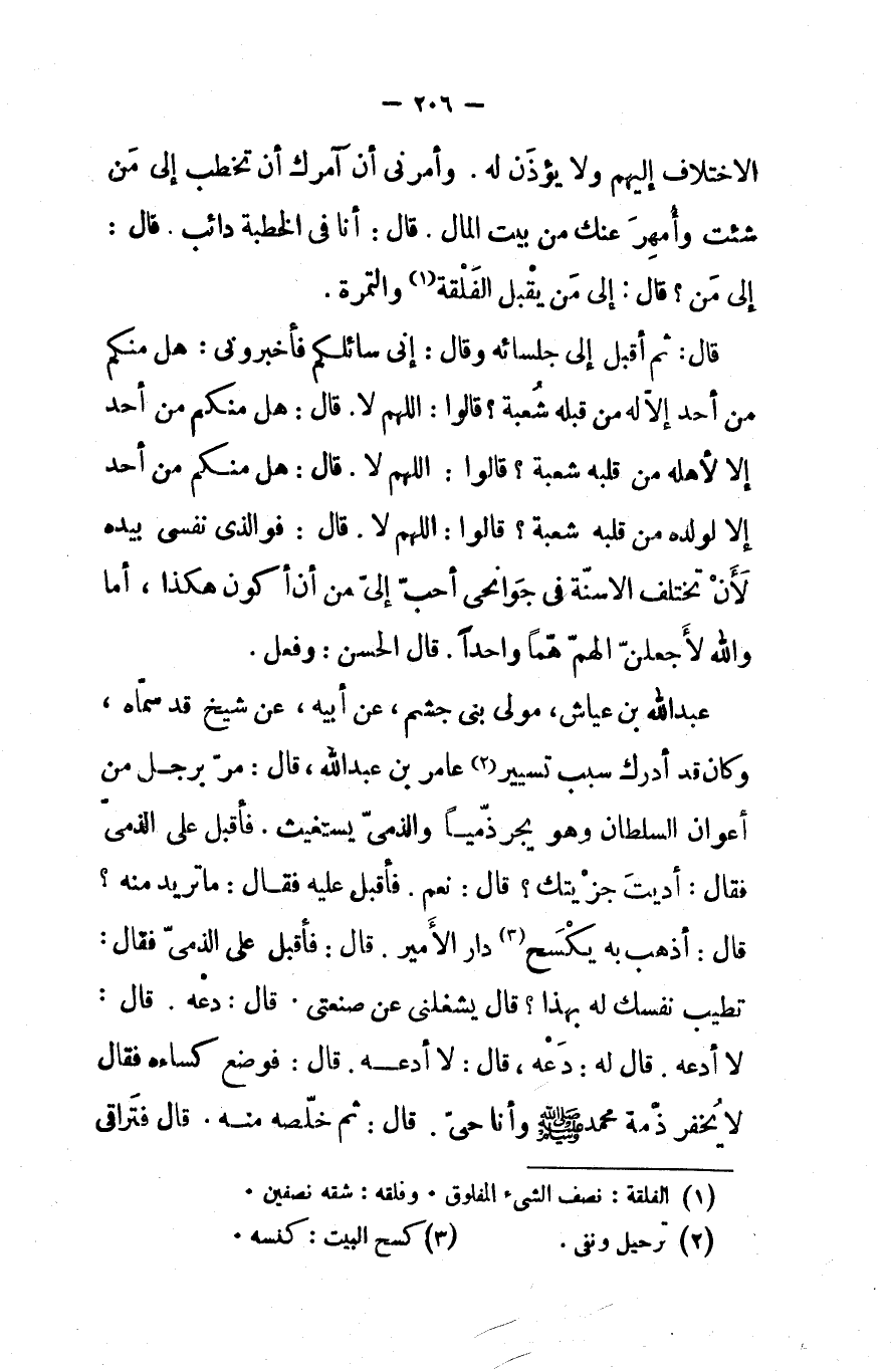 عبدالله بن عياش مولى بني جشم عن أبيه عن شيخ قد سماه وكان قد أدرك سبب تسيير عامر بن عبدالله قال مر برجل من أعوان السلطان وهو يجر ذميا والذمى يستغيث فأقبل على الذمى فقال أديت جزيتك قال نعم فأقبل عليه فقال ما تريد منه قال أذهب به يكسح دار الأمير قال فأقبل على الذمى فقال تطيب نفسك له بهذا قال يشغلني عن صنعتي قال دعه قال لا أدعه قال له دعه قال لا أدعه قال فوضع كساءه فقال لا يخفر ذمة محمد صلى الله عليه و سلم وأنا حي قال ثم خلصه منه قال فتراقى