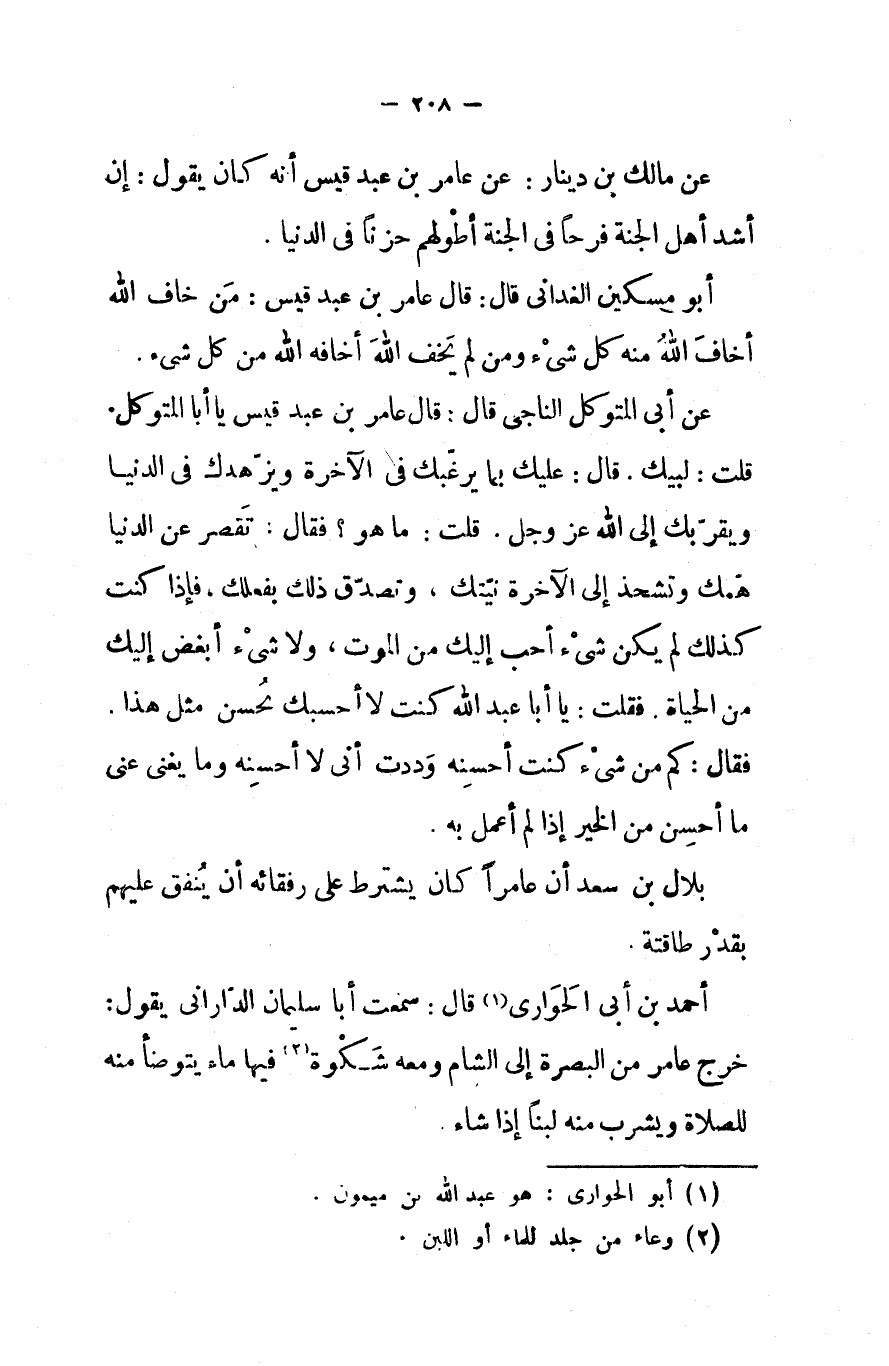 أحمد بن أبي الحواري قال سمعت أبا سليمان الداراني يقول خرج عامر من البصرة إلى الشام ومعه شكوة فيها ماء يتوضأ منه للصلاة ويشرب منه لبنا إذا شاء