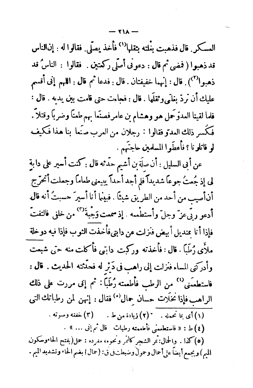 عن أبي السليل أن صلة بن أشيم حدثه قال كنت أسير على دابة لي إذ جعت جوعا شديدا فلم أجد أحدا يبيعني طعاما وجعلت أتحرج أن اصيب من أحد من الطريق شيئا فبينما أنا أسير حسبت أنه قال أدعو ربي عز و جل وأستطعمه إذ سمعت وجبة من خلفي فالتفت فإذا أنا بمنديل أبيض فنزلت عن دابتي فأخذت الثوب فإذا فيه دوخلة ملأى رطبا قال فأخذته وركبت دابتى فأكلت منه حتى شبعت وأدركني المساء فنزلت إلى راهب في دير له فحدثته الحديث قال فاستطعمني من الرطب فأطعمته رطبا ثم إني مررت على ذلك الراهب فإذا نخلات حسان حمال فقال إنهن لمن رطباتك التي