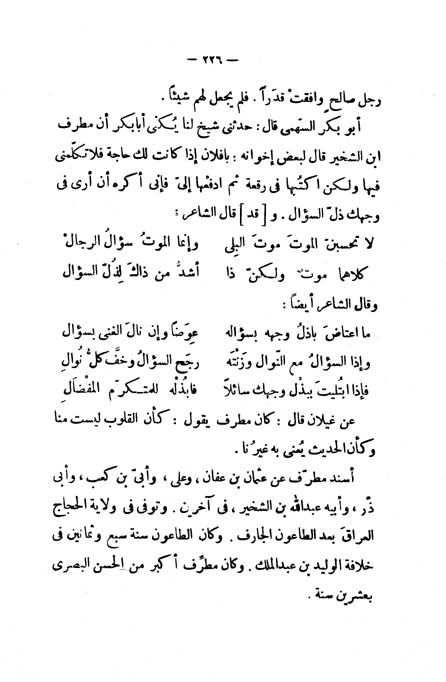 أبو بكر السهمى قال حدثني شيخ لنا يكنى أبا بكر أن مطرف ابن الشخير قال لبعض إخوانه يا فلان إذا كانت لك حاجة فلا تكلمني فيها ولكن اكتبها في رقعة ثم ادفعها إلي فإني أكره أن أرى في وجهك ذل السؤال و قد قال الشاعر