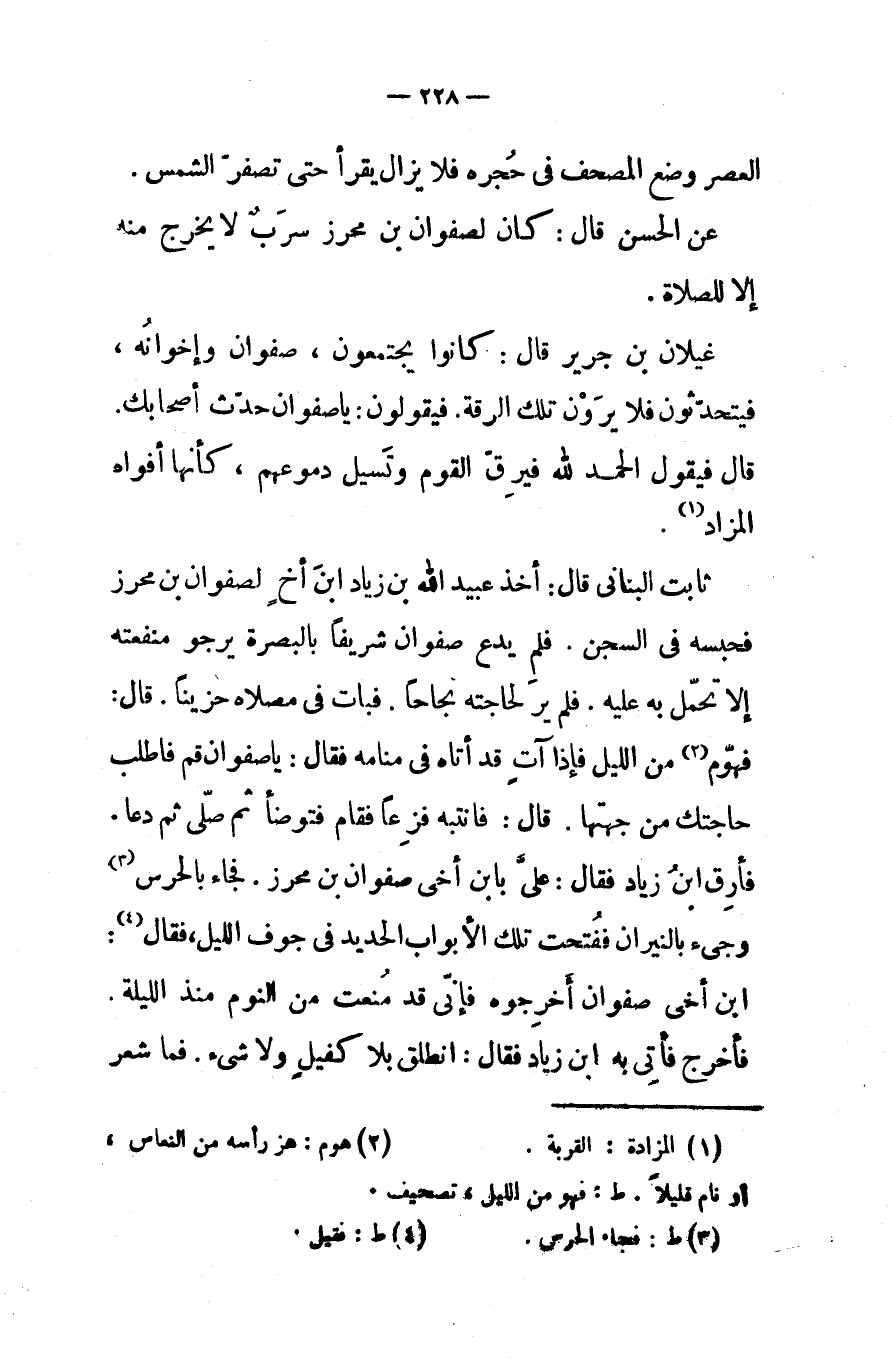 ثابت البناني قال أخذ عبيد الله بن زياد ابن أخ لصفوان بن محرز فحبسه في السجن فلم يدع صفوان شريفا بالبصرة يرجو منفعته إلاتحمل به عليه فلم ير لحاجته نجاحا فبات في مصلاه حزينا قال فهوم من الليل فإذا آت قد أتاه في منامه فقال يا صفوان قم فاطلب حاجتك من جهتها قال فانتبه فزعا فقام فتوضأ ثم صلى ثم دعا فأرق ابن زياد فقال على بابن أخي صفوان بن محرز فجاء بالحرس وجىء بالنيران ففتحت تلك الأبواب الحديد في جوف الليل فقال ابن أخي صفوان أخرجوه فإني قد منعت من النوم منذ الليلة فأخرج فأتى به ابن زياد فقال انطلق بلا كفيل ولا شيء فما شعر