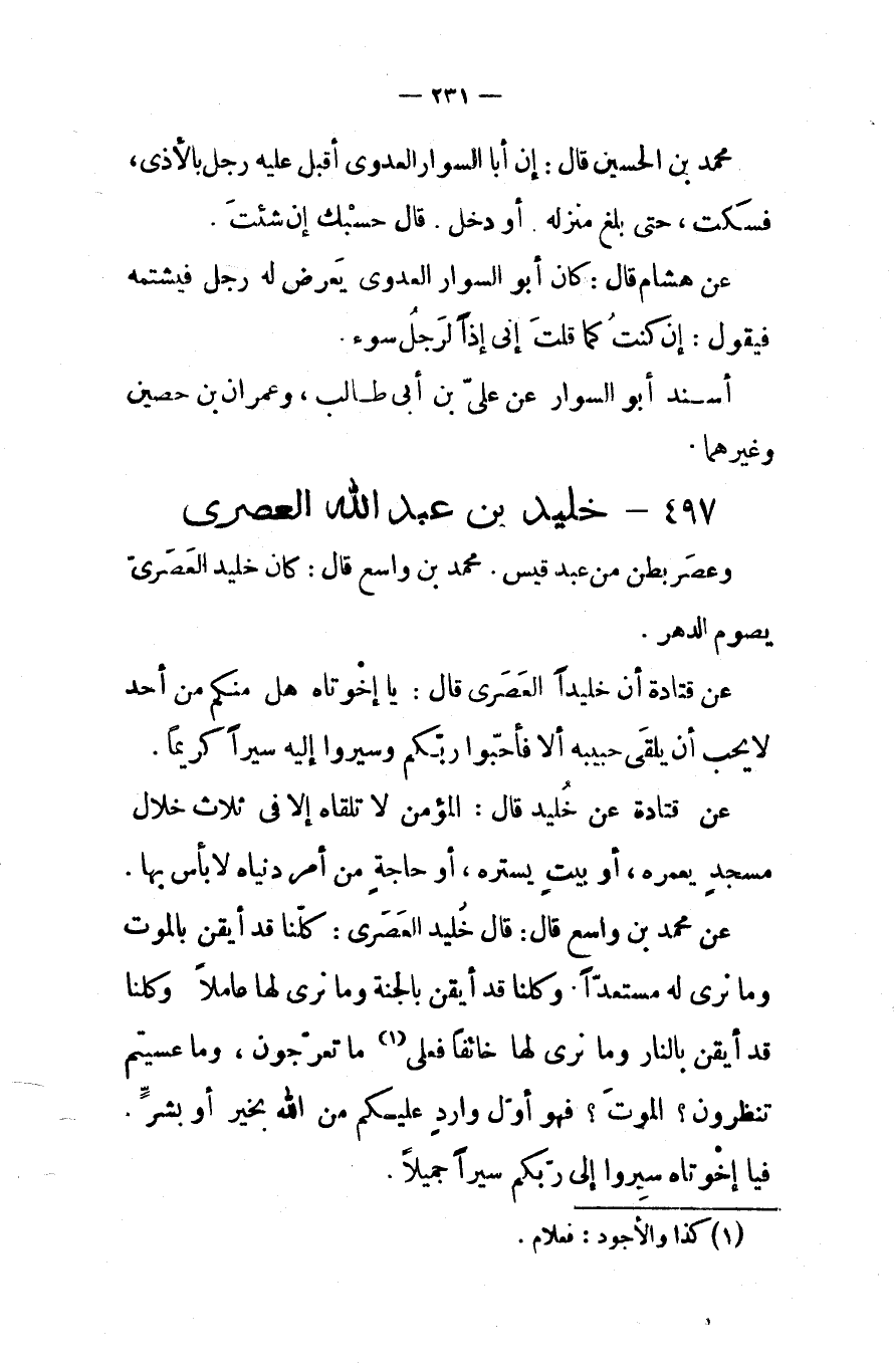 عن محمد بن واسع قال قال خليد العصرى كلنا قد أيقن بالموت وما نرى له مستعدا وكلنا قد أيقن بالجنة وما نرى لها عاملا وكلنا قد أيقن بالنار وما نرى لها خائفا فعلى ما تعرجون وما عسيتم تنظرون الموت فهو أول وارد عليكم من الله بخير أو بشر فيا إخوتاه سيروا إلى ربكم سيرا جميلا