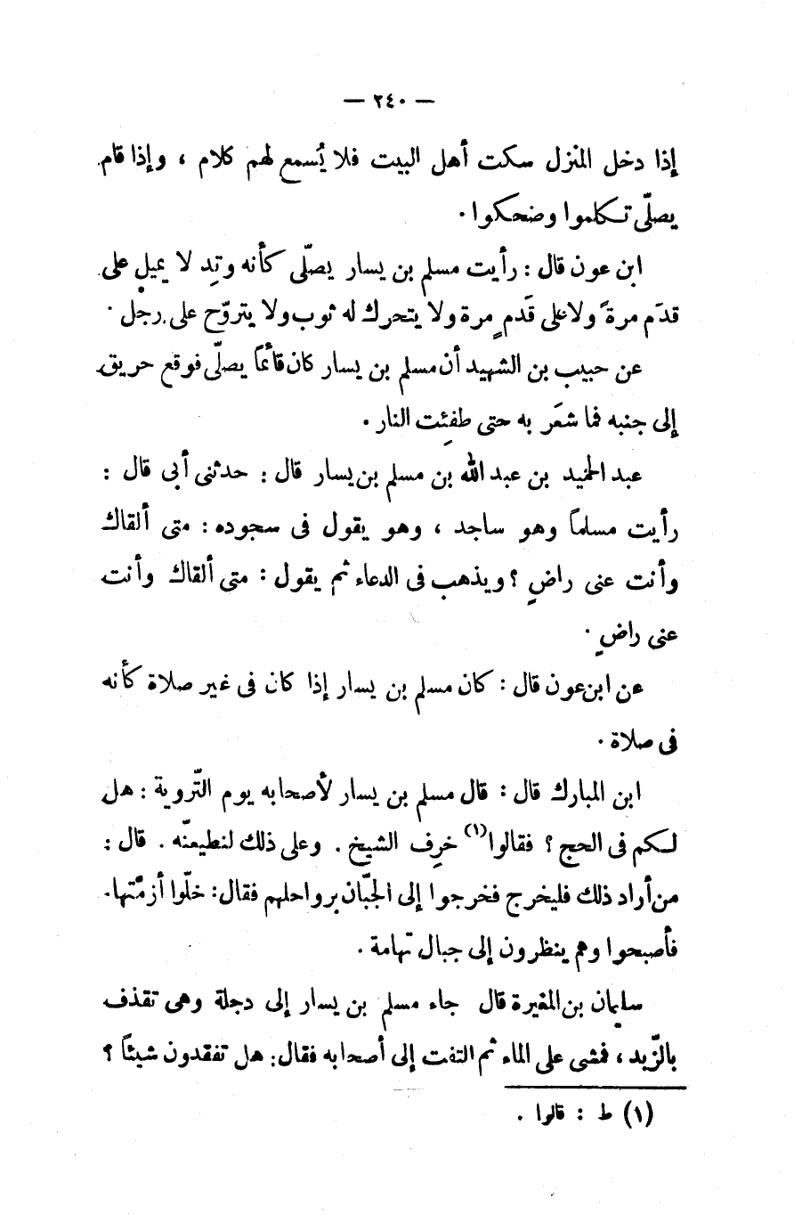 ابن المبارك قال قال مسلم بن يسار لأصحابه يوم التروية هل لكم في الحج فقالوا خرف الشيخ وعلى ذلك لنطيعنه قال من أراد ذلك فليخرج فخرجوا إلى الجبان برواحلهم فقال خلوا أزمتها فأصبحوا وهم ينظرون إلى جبال تهامة