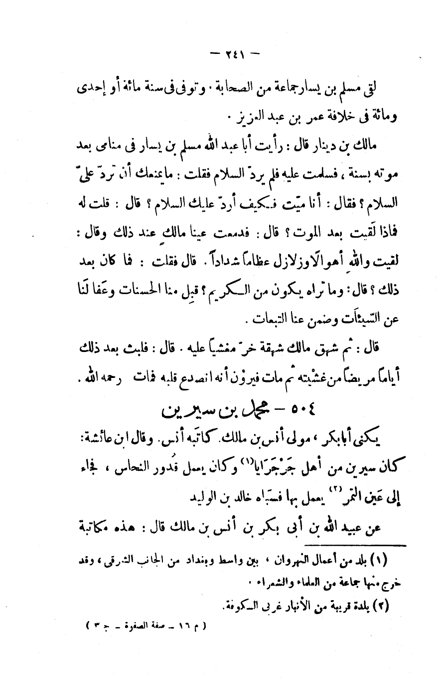 مالك بن دينار قال رأيت أبا عبدالله مسلم بن يسار في منامي بعد موته بسنة فسلمت عليه فلم يرد السلام فقلت ما يمنعك أن ترد على السلام فقال أنا ميت فكيف أرد عليك السلام قال قلت له فماذا لقيت بعد الموت قال فدمعت عينا مالك عند ذلك وقال لقيت والله أهوالا وزلازل عظاما شدادا قال فقلت فما كان بعد ذلك قال وما تراه يكون من الكريم قبل منا الحسنات وعفا لنا عن السيئات وضمن عنا التبعات