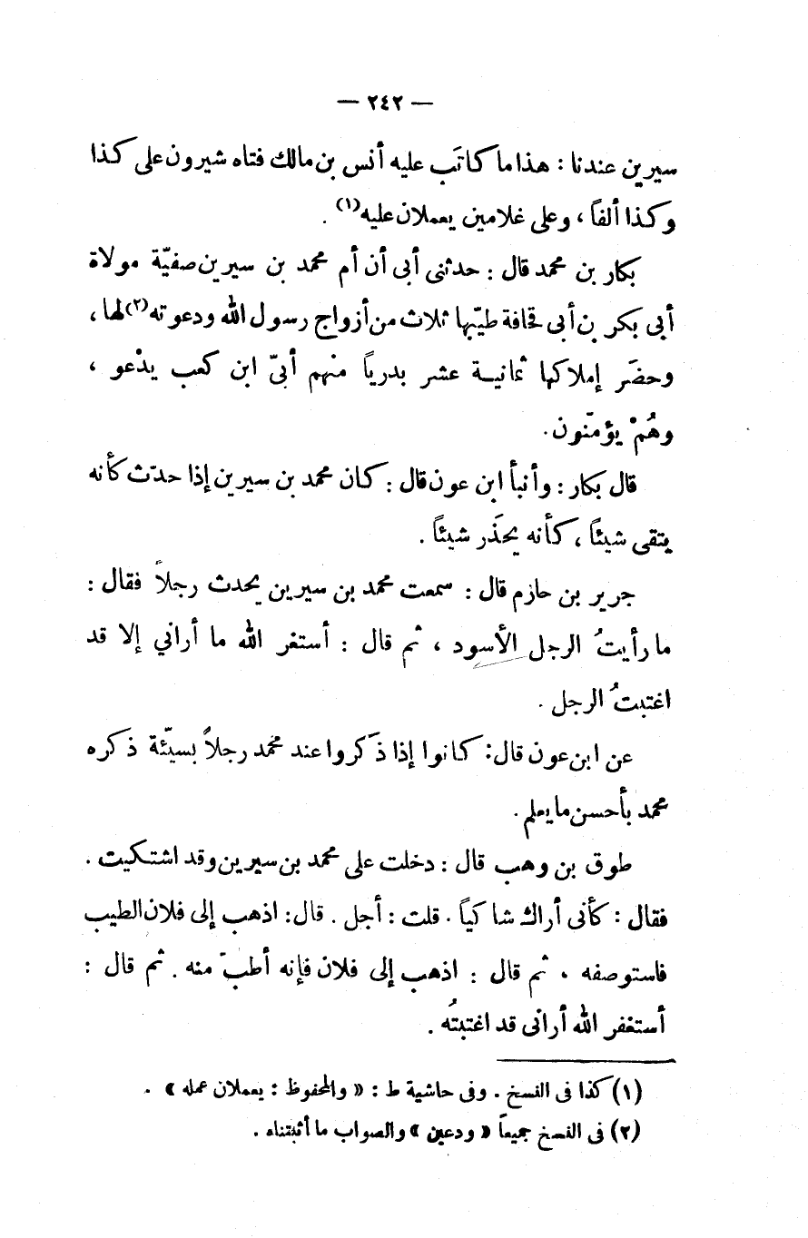 طوق بن وهب قال دخلت على محمد بن سيرين وقد اشتكيت فقال كأني أراك شاكيا قلت أجل قال اذهب إلى فلان الطيب فاستوصفه ثم قال اذهب إلى فلان فإنه أطب منه ثم قال أستغفر الله أراني قد اغتبته