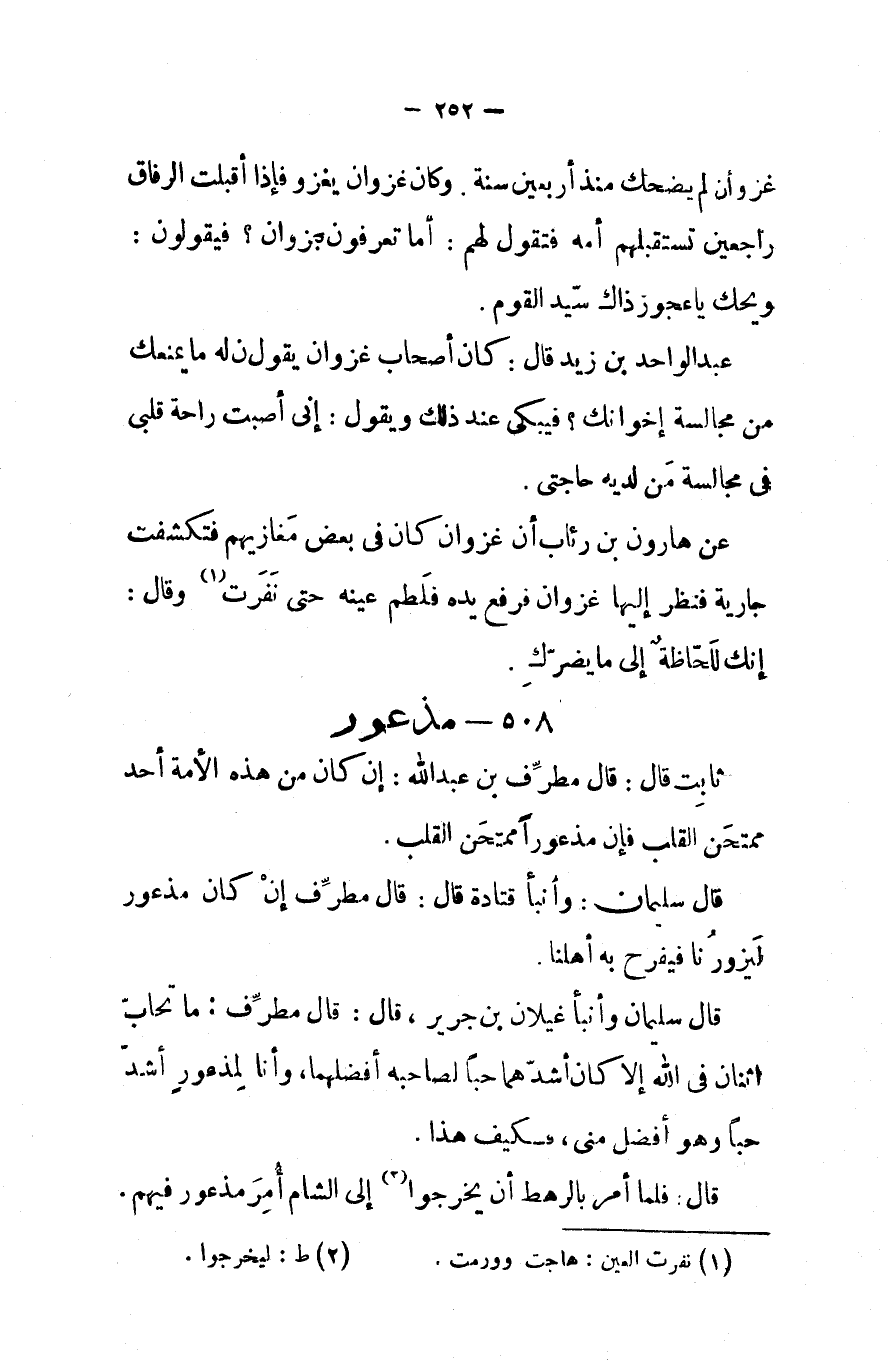 عبدا الواحد بن زيد قال كان أصحاب غزوان يقولون له ما يمنعك من مجالسة إخوانك فيبكى عند ذلك ويقول إني اصبت راحة قلبي في مجالسة من لديه حاجتي