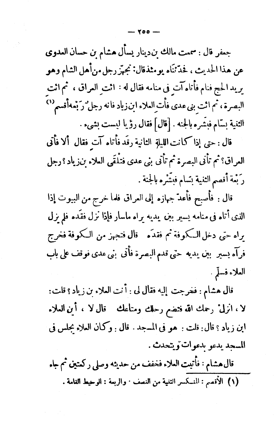 جعفر قال سمعت مالك بن دينار يسأل هشام بن حسان العدوى عن هذا الحديث فحدثناه يومئذ قال تجهز رجل من أهل الشام وهو يريد الحج فنام فأتاه آت في منامه فقال له أئت العراق ثم ائت البصرة ثم ائت بني عدي فأت العلاء ابن زياد فإنه رجل ربعه أقسمالثنية بسام فبشره بالجنة قال فقال رؤيا ليست بشيء