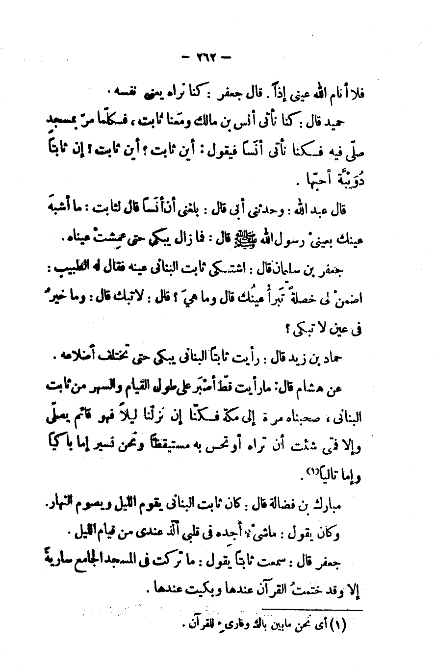 مبارك بن فضالة قال كان ثابت البناني يقوم الليل ويصوم النهار وكان يقول ماشىء أجده في قلبي ألذ عندي من قيام الليل