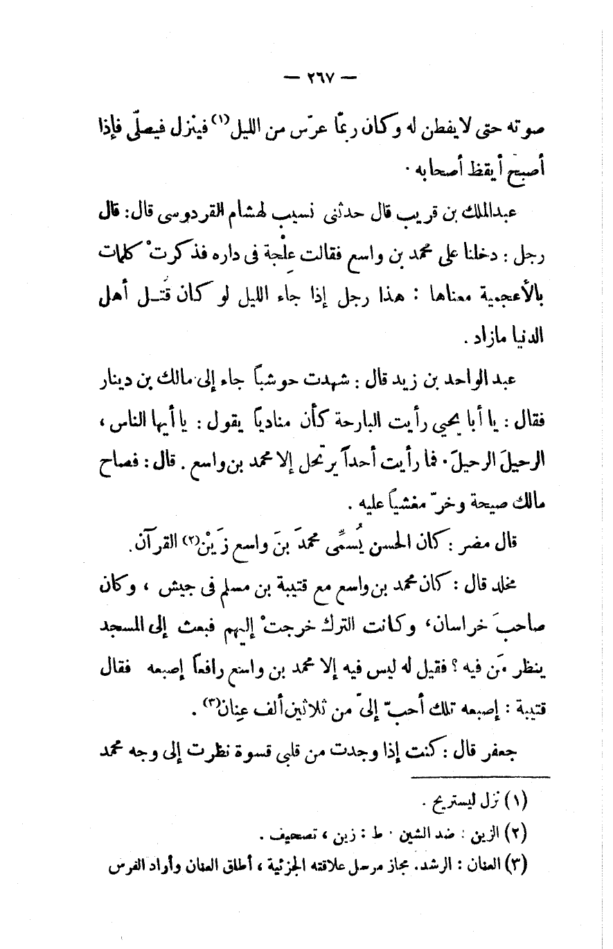 عبدالملك بن قريب قال حدثني نسيب لهشام القردوسي قال قال رجل دخلنا على محمد بن واسع فقالت علجة في داره فذكرت كلمات بالأعجمية معناها هذا رجل إذا جاء الليل لو كان قتل أهل الدنيا ما زاد
