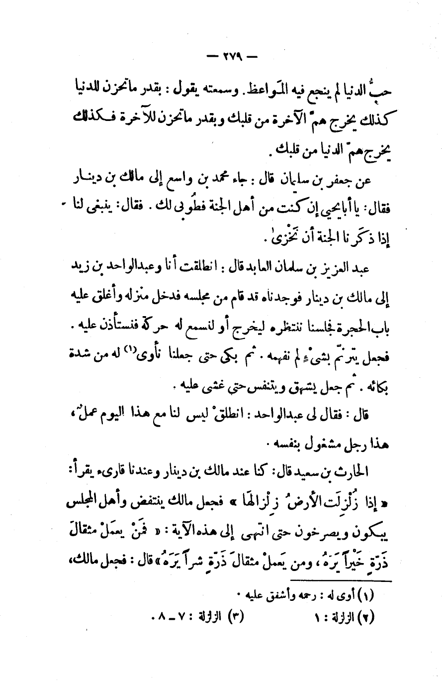 الحارث بن سعيد قال كنا عند مالك بن دينار وعندنا قارىء يقرأ إذا زلزلت الأرض زلزالها فجعل مالك ينتفض وأهل المجلس يبكون ويصرخون حتى انتهى إلى هذه الآية فمن يعمل مثقال ذرة خيرا يره ومن يعمل مثقال ذرة شرا يره قال فجعل مالك