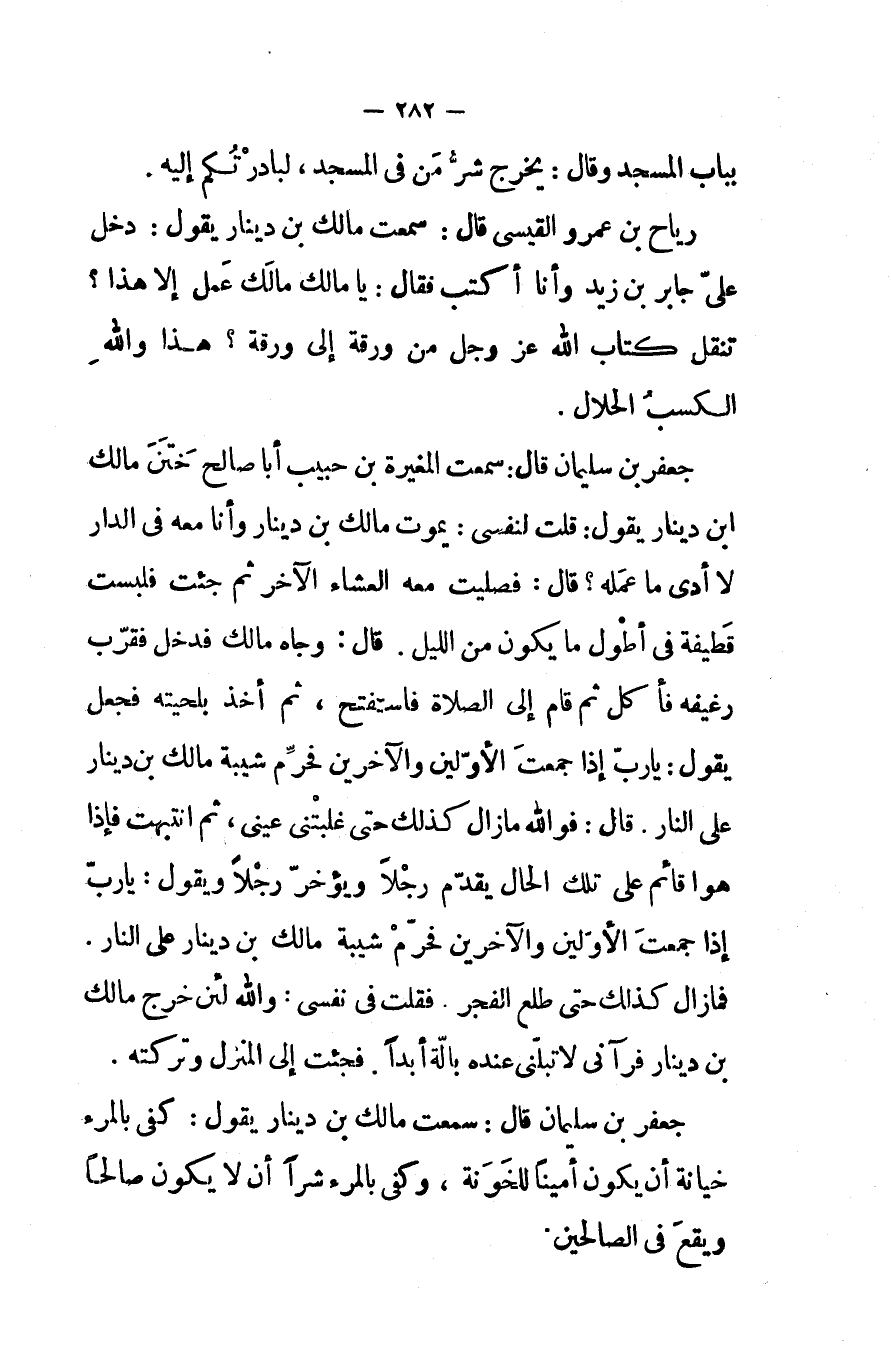 رياح بن عمرو القيسى قال سمعت مالك بن دينار يقول دخل على جابر بن زيد وأنا أكتب فقال يا مالك مالك عمل إلا هذا تنقل كتاب الله عز و جل من ورقة إلى ورقة هذا والله الكسب الحلال
