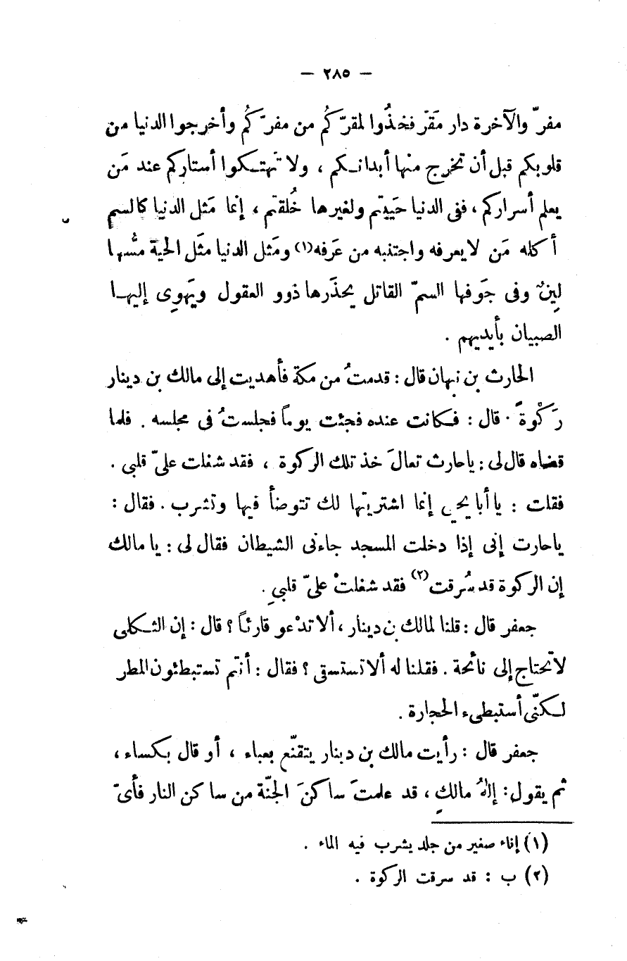 الحارث بن نبهان قال قدمت من مكه فأهديت إلى مالك بن دينار ركوة قال فكانت عنده فجئت يوما فجلست فى مجلسه فلما قضاه قال لى ياحارث تعال خذ تلك الركوة فقد شغلت على قلبى فقلت ياأبا يحيى إنما اشتريتها لك تتوضأ فيها وتشرب فقال ياحارث إنى إذا دخلت المسجد جاءنى الشيطان فقال لى يامالك إن الركوة قد سرقت فقد شغلت على قلبى