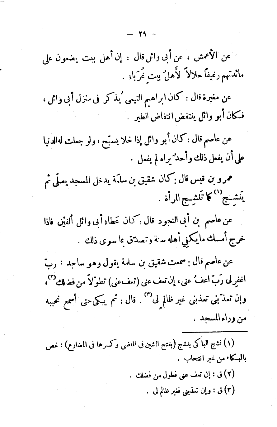 عن عاصم قال سمعت شقيق بن سلمة يقول وهو ساجد رب اغفر لي رب اعف عني إن تعف عني تعف عني تطولا من فضلك وإن تعذبني تعذبني غير ظالم لي قال ثم يبكى حتى اسمع نحيبه من وراء المسجد