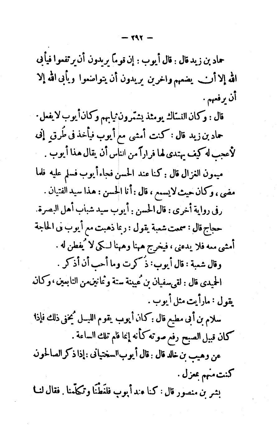 حماد بن زيد قال كنت أمشى مع أيوب فيأخذ فى طرق إنى لأعجب له كيف يهتدى لها فرارا من الناس أن يقال هذا أيوب