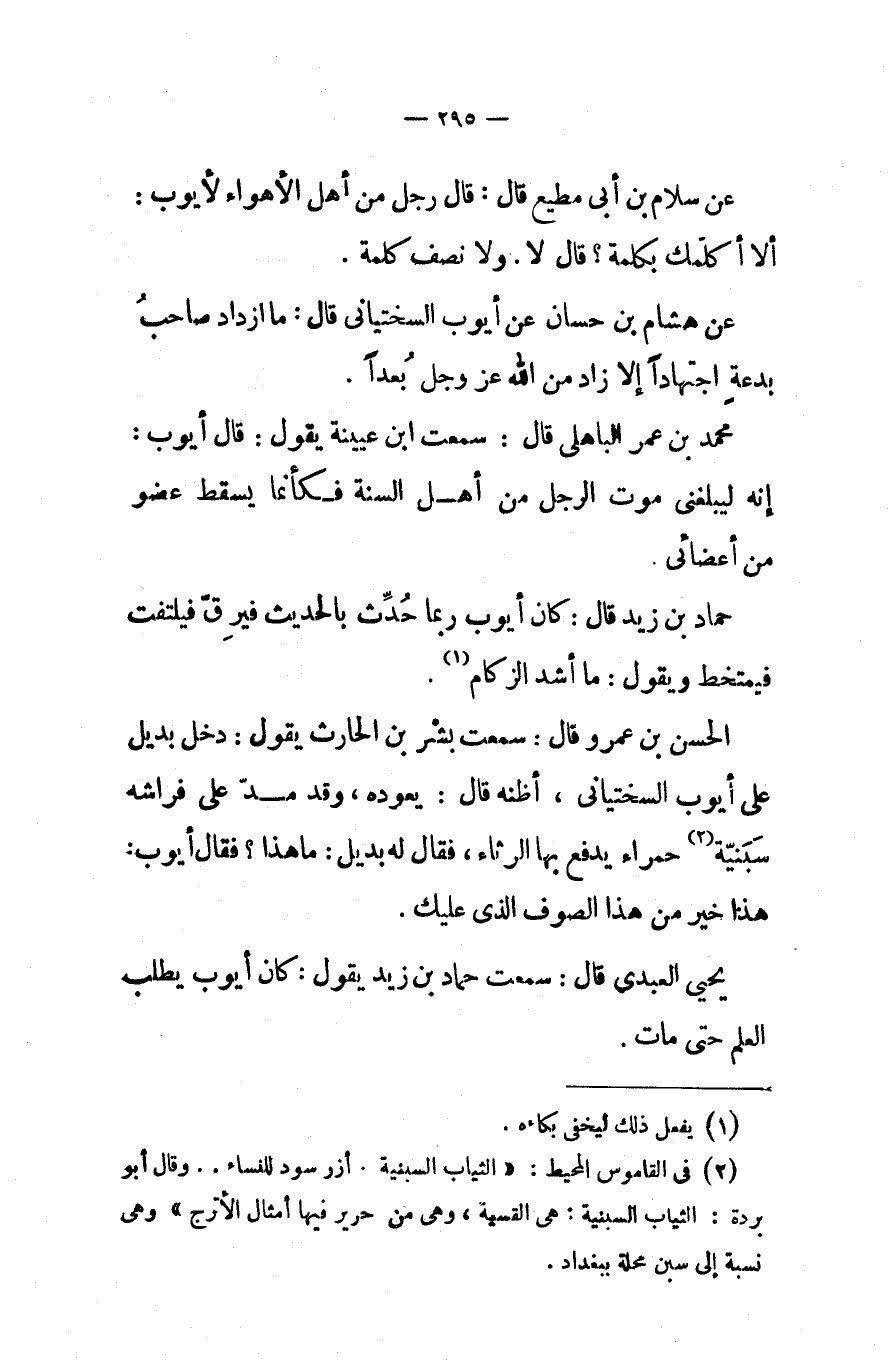 الحسن بن عمرو قال سمعت بشر بن الحارث يقول دخل بديل على أيوب السختيانى أظنه قال يعوده وقد مد على فراشه سبنية حمراء يدفع بها الرثاء قال له بديل ما هذا فقال أيوب هذا خير من هذا الصوف الذى عليك