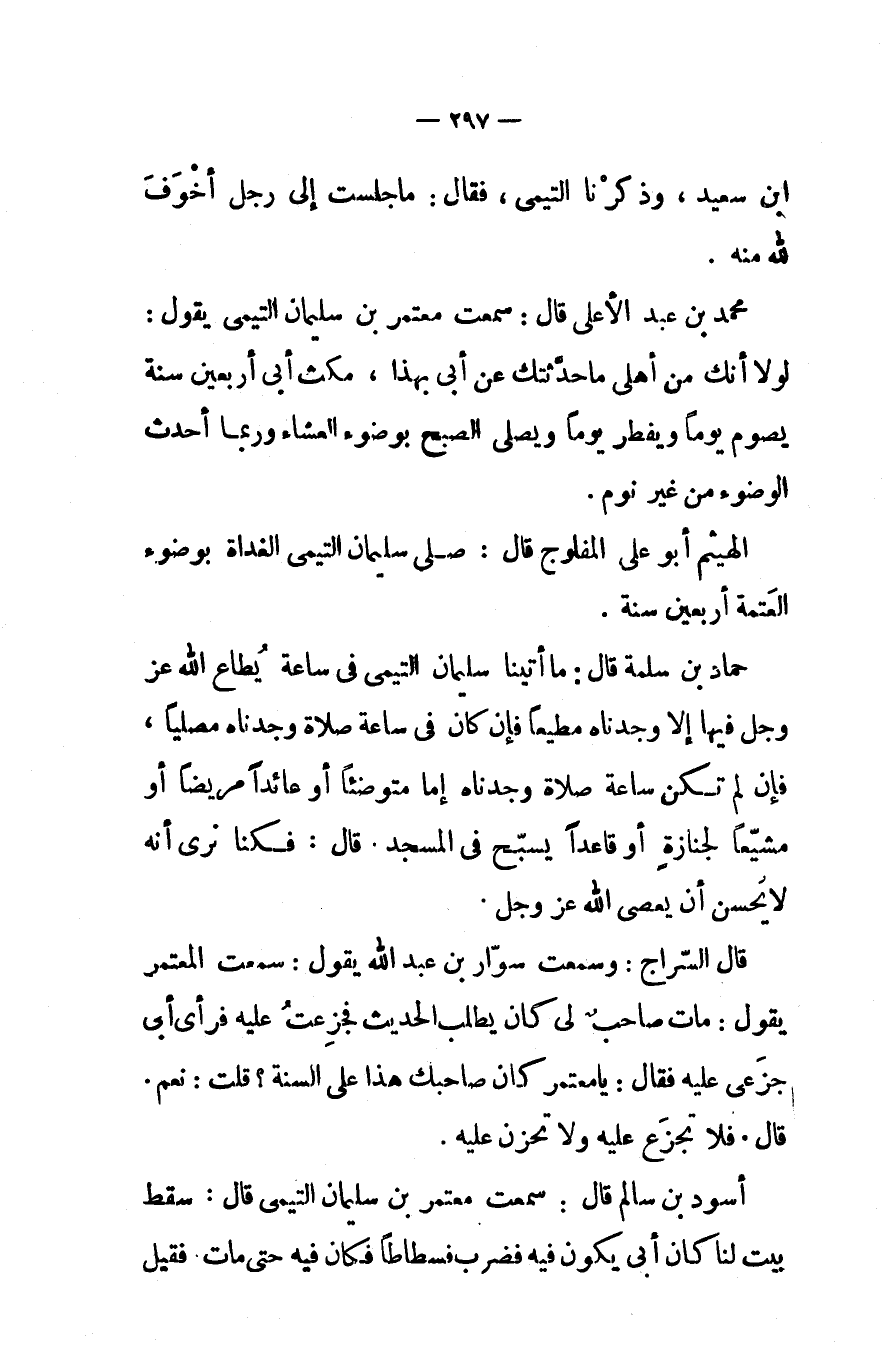 ابن سعيد وذكرنا التيمي فقال ما جلست إلى رجل أخوف لله منه