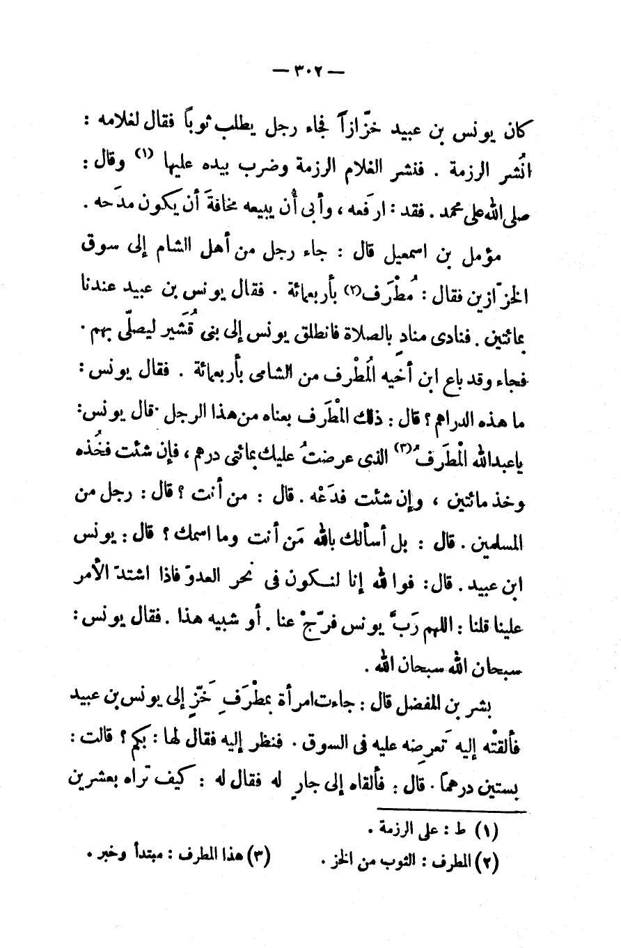 مؤمل بن اسمعيل قال جاء رجل من أهل الشام إلى سوق الخزازين فقال مطرف بأربعمائه فقال يونس بن عبيد عندنا بمائتين فنادى مناد بالصلاة فانطلق يونس إلى بنى قشير ليصلى بهم فجاء وقد باع ابن أخيه المطرف من الشامى بأربعمائة فقال يونس ما هذه الدراهم قال ذلك المطرف بعناه من هذا الرجل قال يونس يا عبد الله المطرف الذى عرضت عليك بمائتى درهم فإن شئت فخذه وخذ مائتين وإن شئت فدعه قال من أنت قال رجل من المسلمين قال بل أسألك باالله من أنت وما اسمك قال يونس ابن عبيد قال فوالله إنا لنكون فى نحر العدو فاذا اشتد الأمرعلينا قلنا اللهم رب يونس فرج عنا أو شبيه هذا فقال يونس سبحان الله سبحان الله
