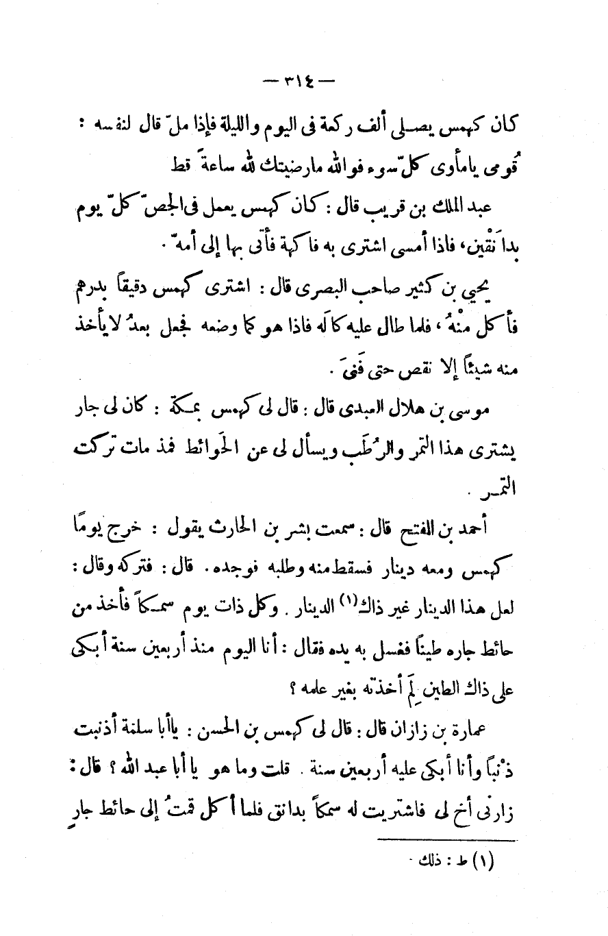 أحمد بن الفتح قال سمعت بشر بن الحارث يقول خرج يوما كهمس ومعه دينار فسقط منه وطلبه فوجده قال فتركه وقال لعل هذا الدينار غير ذاك الدينار وكل ذات يوم سمكا فأخذ من حائط جاره طينا فغسل به يده فقال أنا اليوم منذ أربعين سنه أبكى على ذاك الطين لم أخذته بغير علمه